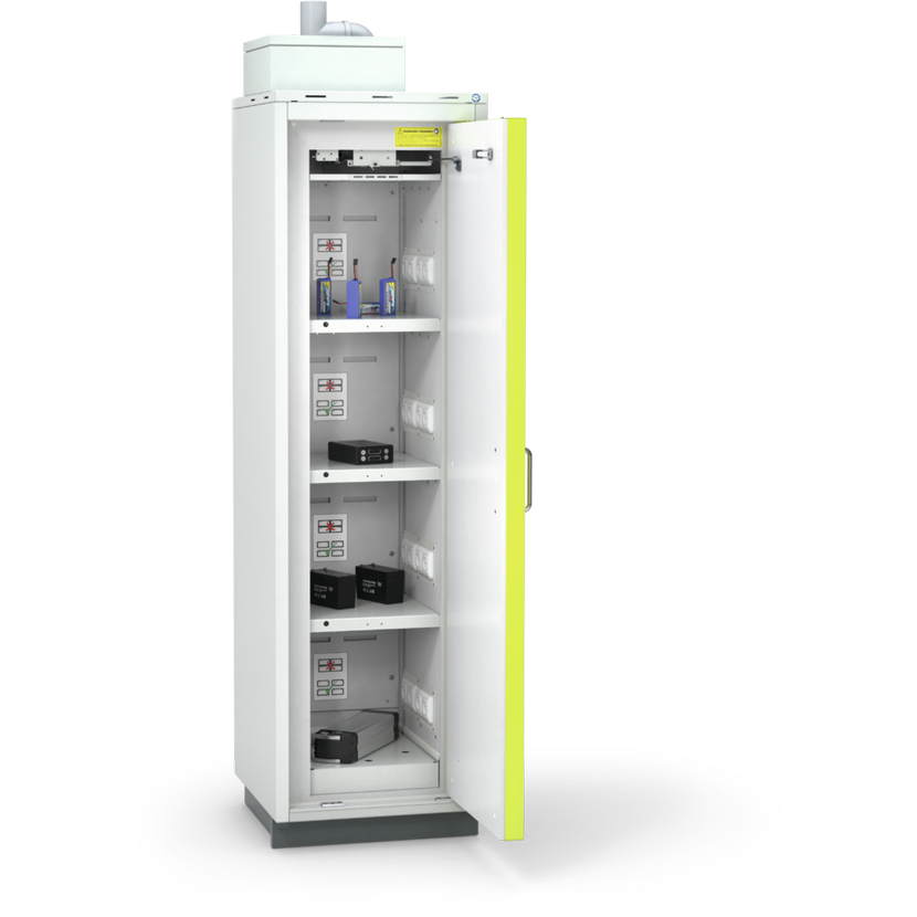 Pro skladování a nabíjení lithium-iontových baterií. Rozměry 594 x 612 x 2085 (Š x H x V) mm. Požární odolnost 90 minut. Křídlové dveře s klasickým otevíráním. 4 police + záchytná vana.
