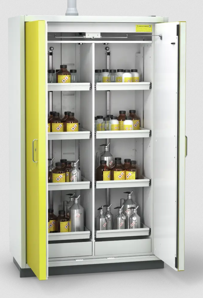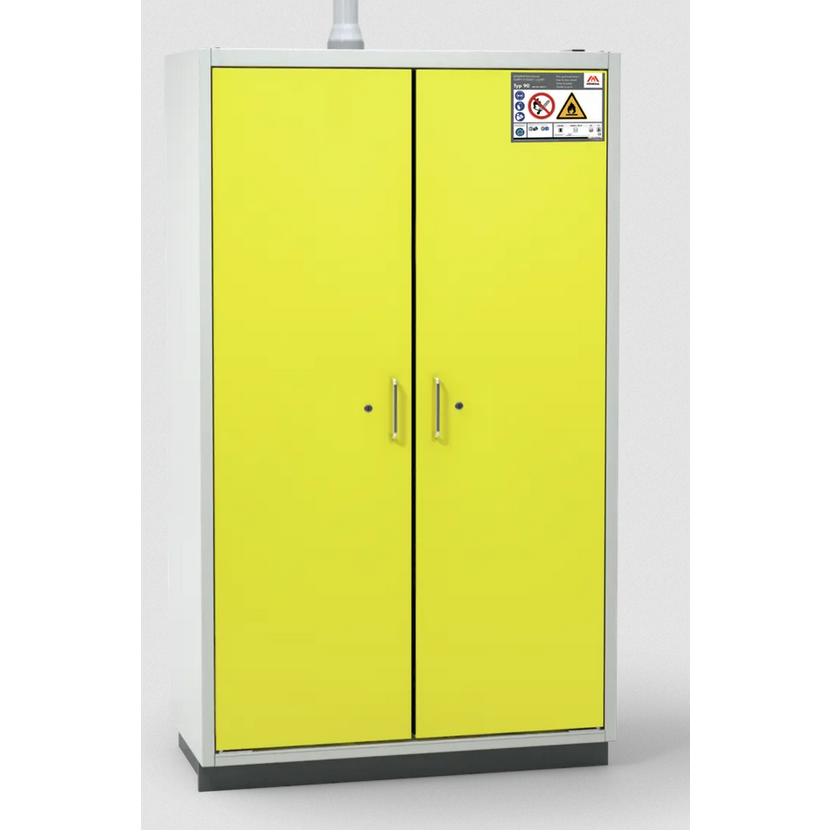 Bezpečnostní skříň s křídlovými dveřmi pro skladování hořlavých kapalin. Typově zkoušené MPA / TÜV SÜD dle DIN EN 14470-1, laboratorní nábytek standardní DIN EN 14727, EK5 / AK4 09-10: 2009 a TRGS 510 Příloha 3. Schvalovací značky: GS / CE, Značka kvality schválena TÜV SÜD Vnější rozměry cca: 1194 x 612 x 2085 (Š x H x V) mm Vnitřní rozměry cca: 1098 x 469 x 1700 (Š x H x V) mm Konstrukce a barva: Vnější část z ocelového plechu, prášková barva v odstínu RAL 7035 (světle šedá) Křídlové dveře z ocelového plechu, prášková barva v odstínu RAL 1018 (zinek žlutý) Vnitřní prostor/kostra vyrobeno z vysoce kvalitních materiálů v odstínu RAL 7035 (světle šedá) Kování a vlastnosti: - Křídlové dveře s termoelektrickým článkem pro automatické zavírání v případě požáru, dveře zůstávají otevřené v libovolné poloze. - Cylindrický zámek pro zabezpečení přístupu - Spodní zásobník, práškovou barvou v odstínu RAL 7035 - Skladování 2x 4 zásuvkové police, středová stěna, práškovou barvou v odstínu RAL 7035 - Vývod pro odsávání v horní části skříně o průměru 75 mm - Uzemňovací připojení v horní části skříně, spojeno s kostrou skříně včetně vnitřní výbavy - Vizuální kontrola šoupátka ventilace - Nastavitelné nožičky pro vyrovnávání - Set-back base, 85 mm výška.