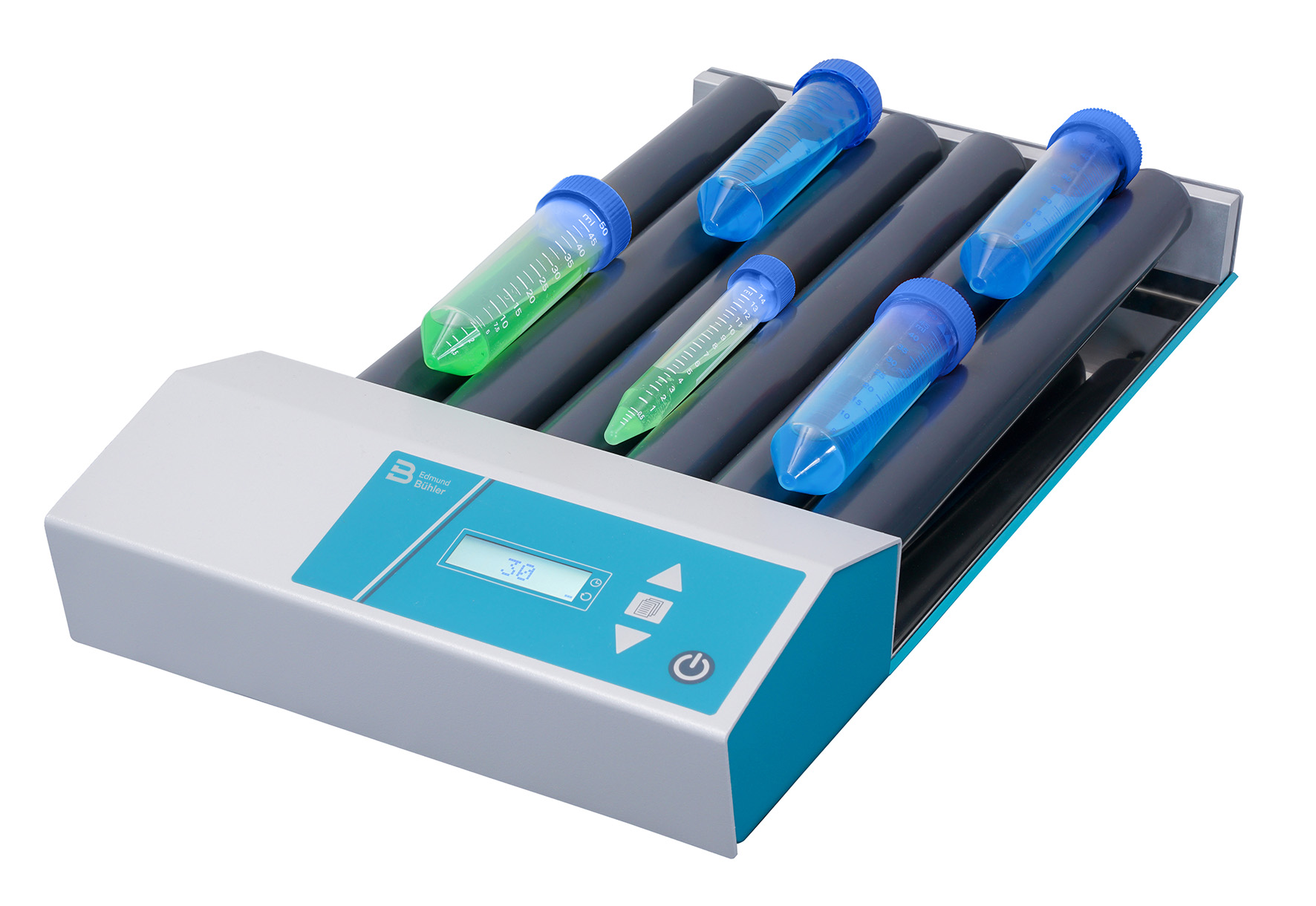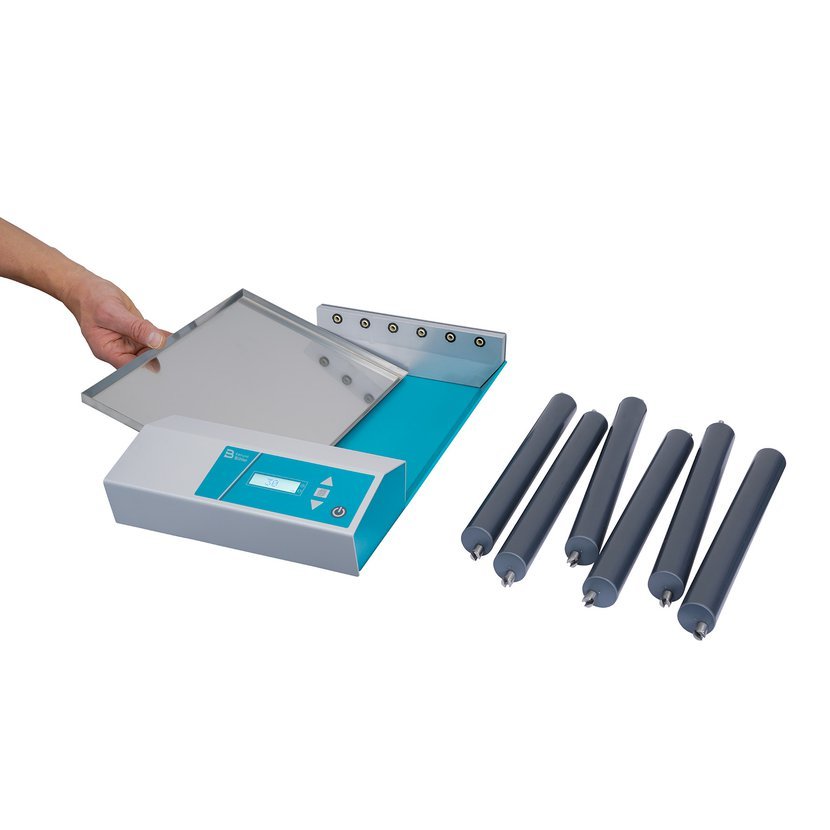 Digitální válečkové míchadlo RM2 se vyznačuje jemným naklápěcím a rotačním pohybem pro rovnoměrné míchání. Je vybaveno 6 odnímatelnými plastovými válečky a záchytnou miskou. Je vhodné pro všechny standardní velikosti zkumavek, baňek a univerzálních nádob do průměru 80 mm.